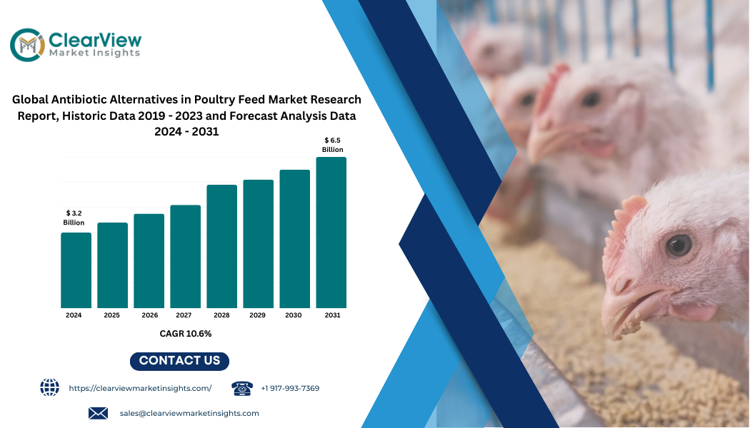 [Rotterdam, Netherlands – May 28th, 2025] – The global market for Antibiotic Alternatives in Poultry Feed, valued at USD 3.2 billion in 2024, is projected to reach USD 6.5 billion by 2031, growing at a CAGR of 10.6%, according to Clearview Market Insights. This surge is driven by regulatory bans on AGPs, increased awareness of antimicrobial resistance, and changing consumer...