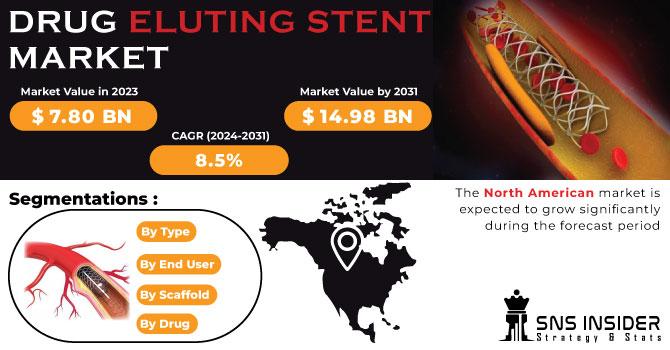 Drug Eluting Stent Market Size The Drug Eluting Stent Market was estimated at USD 7.80 billion in 2023 and is expected to reach USD 14.98 billion by 2031, growing at a compound annual growth rate (CAGR) of 8.5% during the forecast period from 2024 to 2031. Request Your Free Report Sample: https://www.snsinsider.com/sample-request/3323 Market Dynamics Increasing Prevalence of...